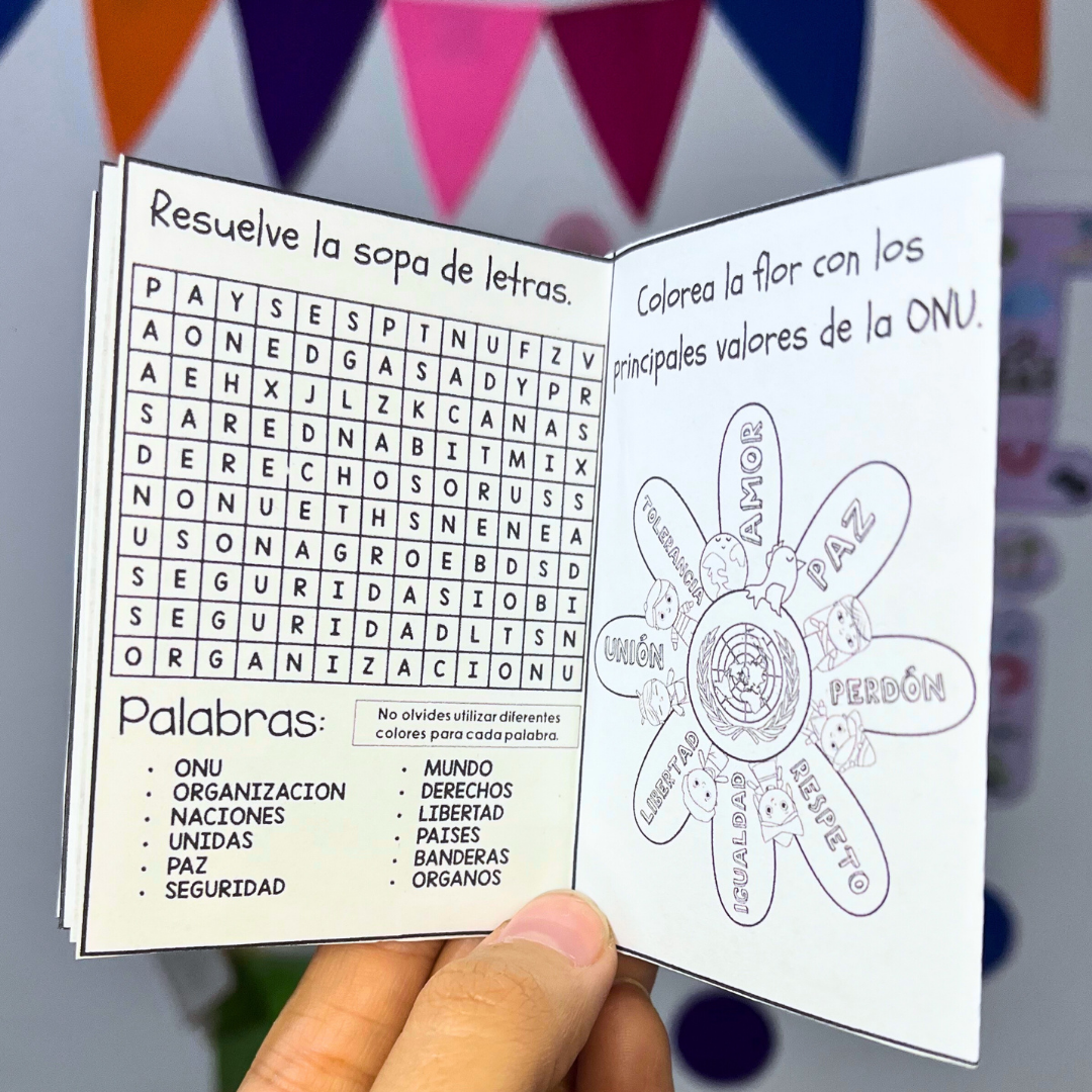 Estos cuadernillos incluyen un texto informativo sobre la historia y los objetivos de la ONU, seguido de preguntas para reforzar la comprensión lectora y fomentar la reflexión. También contiene una sopa de letras con términos clave relacionados con la ONU y una actividad creativa para colorear una flor, en la cual cada pétalo representa uno de los principales valores promovidos por la organización, como la paz, la libertad y los derechos humanos.
