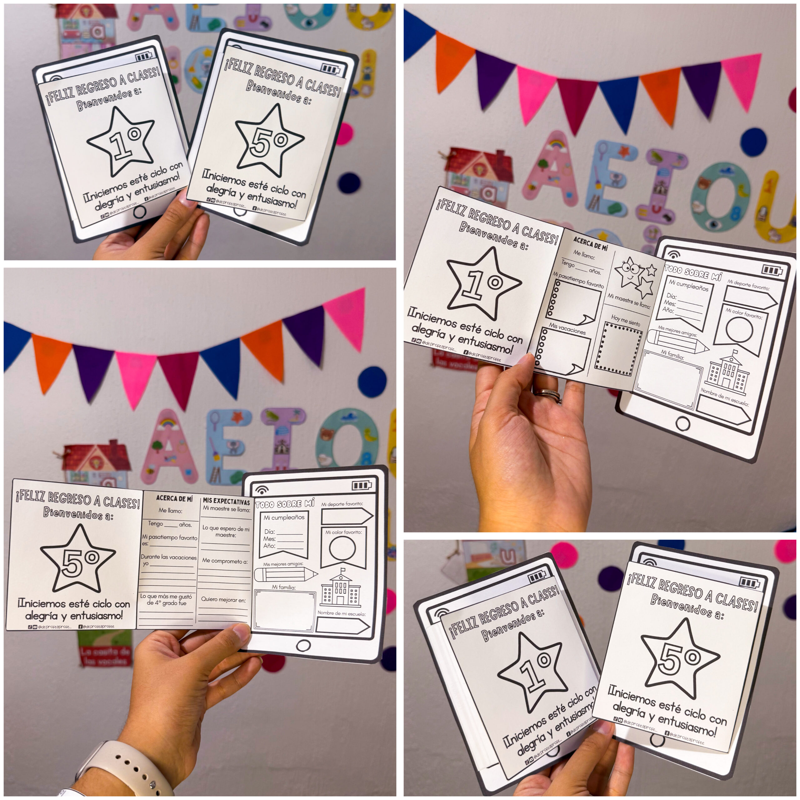 Da la bienvenida al nuevo año escolar con nuestro Kit de Regreso a Clases! Incluye coronitas, pulseras, un interactivo en forma de tablet, plantillas para obsequios y gafetes, además de una presentación sobre ti como maestro. Como BONUS, recibirás un mural de feliz regreso a clases y sugerencias de actividades para los primeros dÃas. Perfecto para crear una atmósfera cálida y divertida en tu aula. ¡Haz que el regreso a clases sea inolvidable!